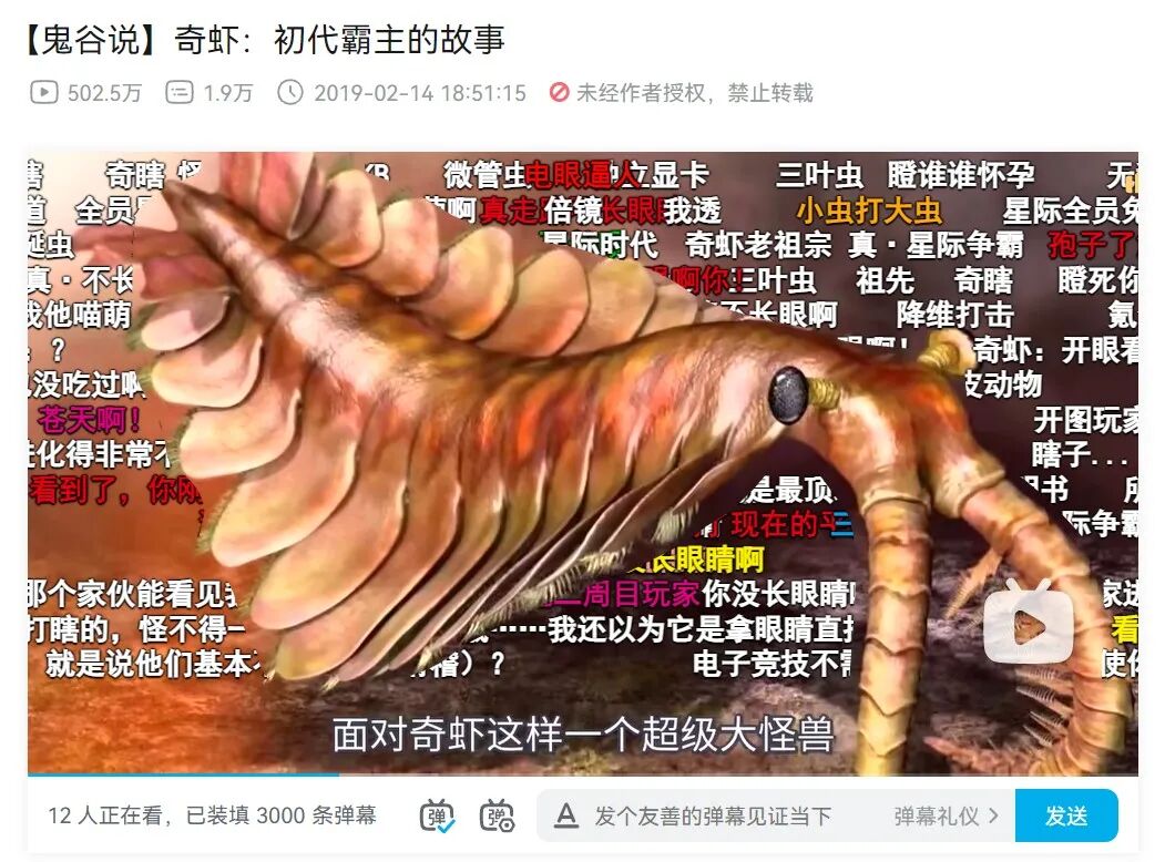在“芳斯塔芙”的视频中,5亿多年前的古生物“奇虾”曾是寒武纪的初代霸主,没有生物是其敌手,却在漫长的生物进化中不知所踪、退出了历史舞台;而处于底层的三叶虫,则像是为了生存而不屈挣扎的平凡家族,凭借着顽强的生命力在地球上生存了3亿多年时间,最终消失于惨烈的“二叠纪末大灭绝”——在唐骋独特的文案与解说下,几亿年前的古生物故事与今天的观众产生了强烈的共鸣,还创造出了“三叶虫向世界竖起了不屈的中指”等网络热梗。