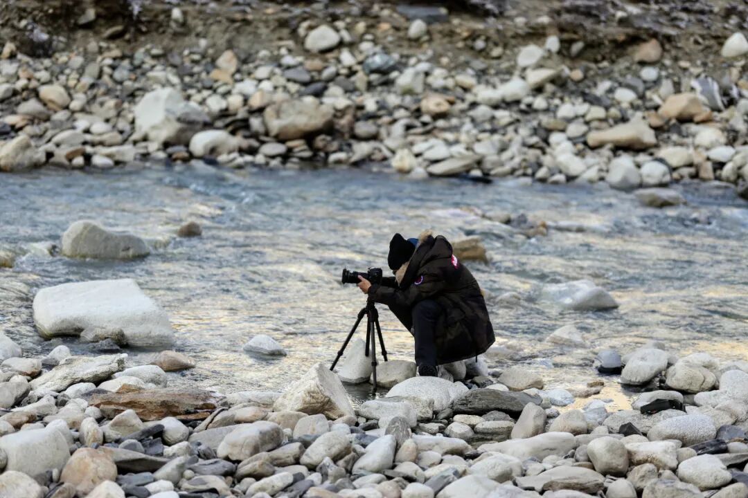 2022年5月2日,新华社记者孙非在海拔5200米的珠峰大本营附近采访拍摄。