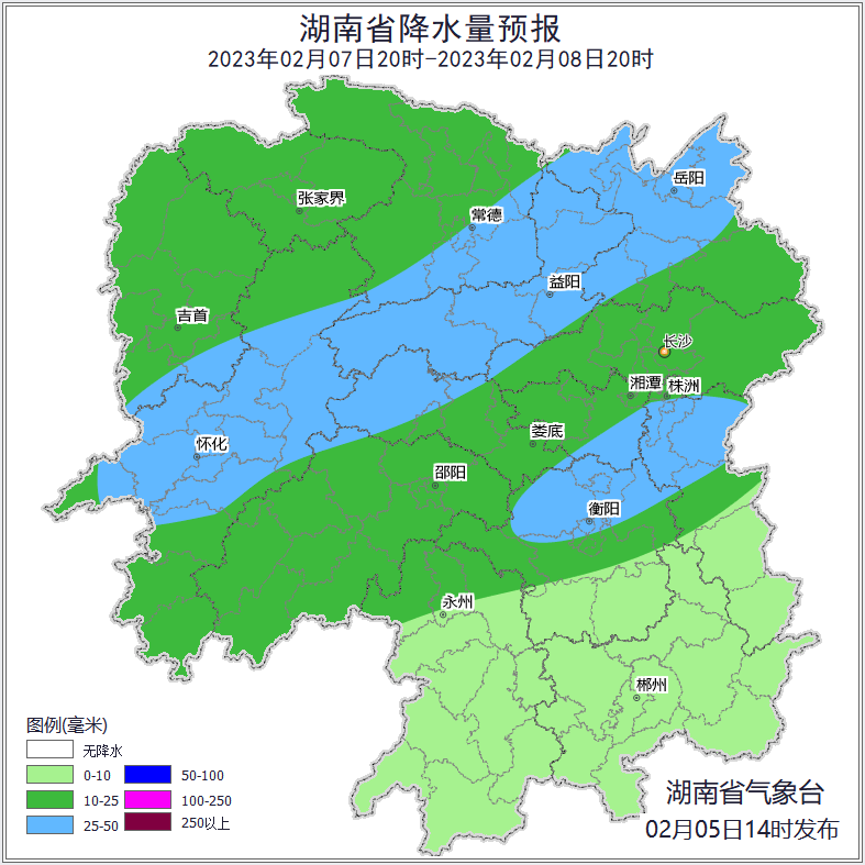 5日20时至6日20时,全省阴天有小雨,湘中、湘南部分地区中雨,其中怀化南部、邵阳中部、株洲中部、永州南部局地大雨;北风2~3级;最高气温湘北8~10℃,其他地区6~8℃;最低气温2~4℃。6日20时至7日20时,永州、郴州阴天有小到中雨,其他地区阴天转小雨;北风2~3级;最高气温8~10℃;最低气温2~4℃。7日20时至8日20时,湘中、湘北阴天有中雨,其中湘西州南部、怀化中北部、娄底西部、常德南部、益阳、岳阳北部、湘潭南部、株洲北部、衡阳北部部分地区大雨,其他地区阴天有小雨;北风2~3级;最高气温湘南9~11℃,其他地区7~9℃;最低气温湘南5~7℃,其他地区3~5℃。