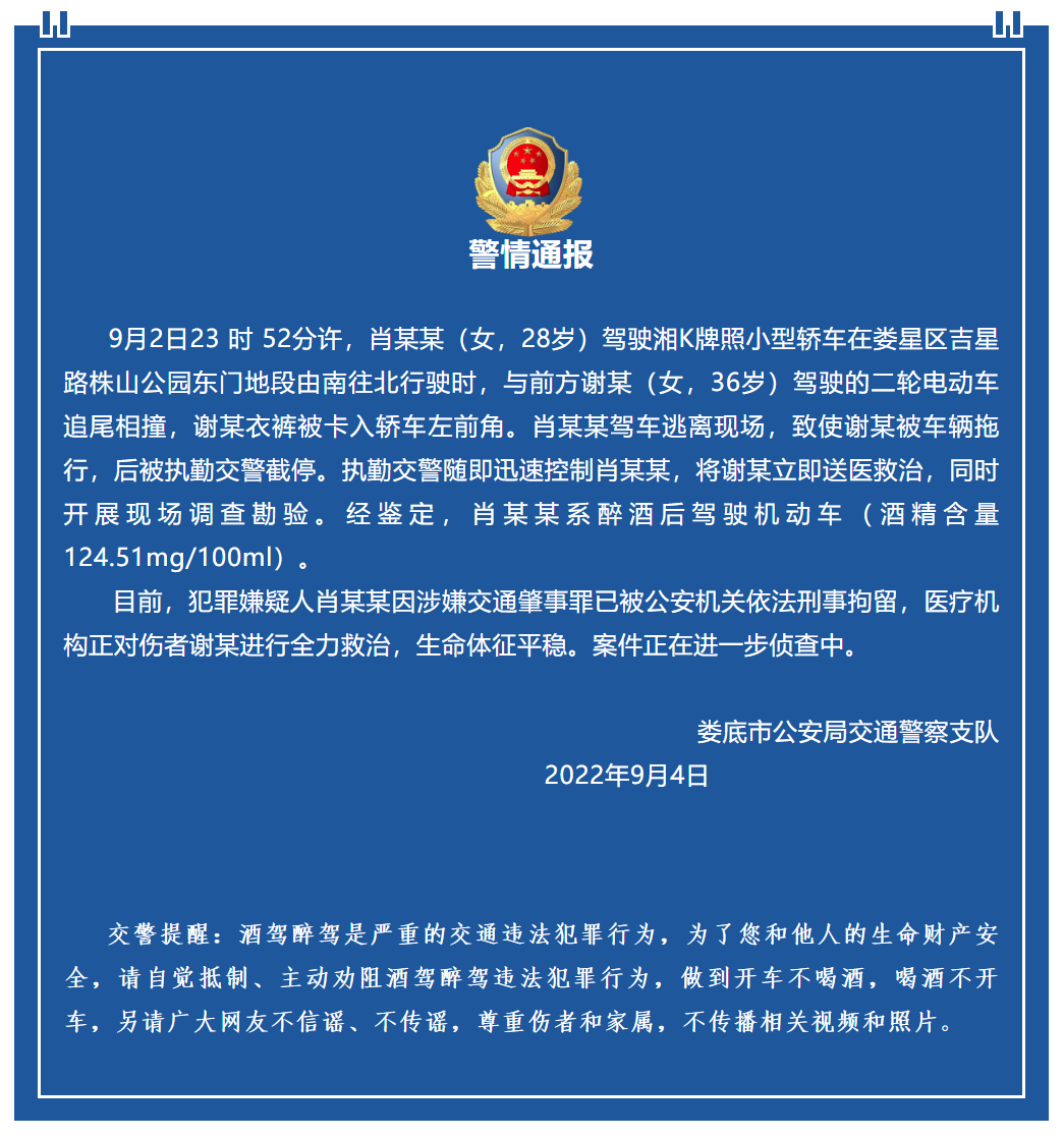 9月2日23时52分许,肖某某(女,28岁)驾驶湘K牌照小型轿车在娄星区吉星路株山公园东门地段由南往北行驶时,与前方谢某(女,36岁)驾驶的二轮电动车追尾相撞,谢某衣裤被卡入轿车左前角。肖某某驾车逃离现场,致使谢某被车辆拖行,后被执勤交警截停。执勤交警随即迅速控制肖某某,将谢某立即送医救治,同时开展现场调查勘验。经鉴定,肖某某系醉酒后驾驶机动车(酒精含量124.51mg/100ml)。