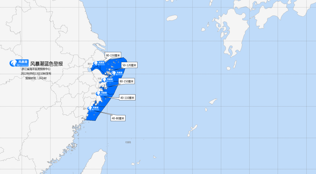 受第12号台风“梅花”(强台风级)影响,预计今天中午到明天中午:嘉兴、宁波沿岸将出现80-150厘米的风暴增水,舟山沿岸将出现50-120厘米的风暴增水,台州沿岸将出现40-110厘米的风暴增水,温州沿岸将出现40-80厘米的风暴增水。嘉兴市、舟山、宁波、台州、温州市风暴潮预警级别为蓝色。受第12号台风“梅花”(强台风级)影响,预计今天中午到明天中午:- 近海海域:杭州湾有1.2米到2.0米的轻到中浪,明天上午增大到2.5米到3.5米的大浪;浙江北部、中部、南部有3.5米到5.0米的大到巨浪,明天上午增大到6.0米到9.0米的狂浪到狂涛。近海海域海浪预警级别为橙色。
