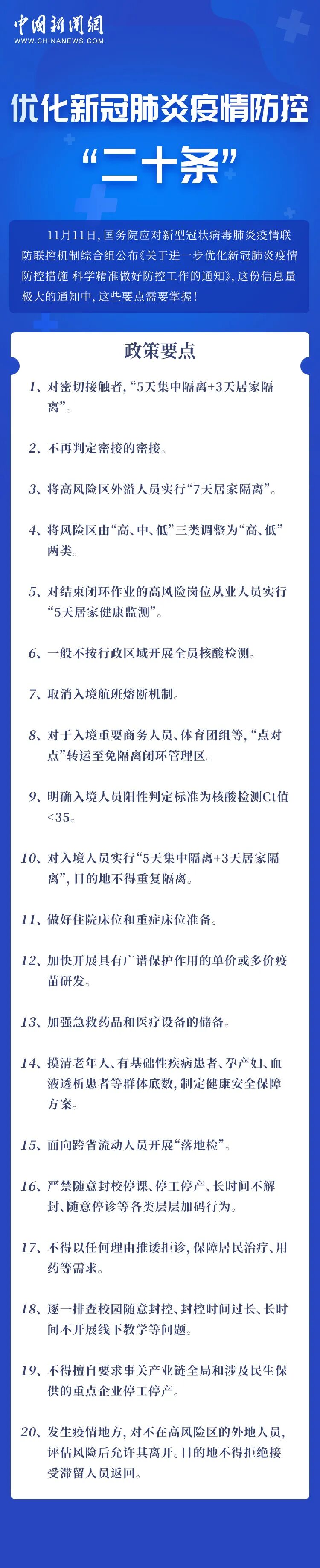 11月10日,中共中央政治局常务委员会召开会议,研究部署进一步优化防控工作的二十条措施。11日,国务院应对新型冠状病毒肺炎疫情联防联控机制综合组发布《关于进一步优化新冠肺炎疫情防控措施 科学精准做好防控工作的通知》,受到广泛关注。