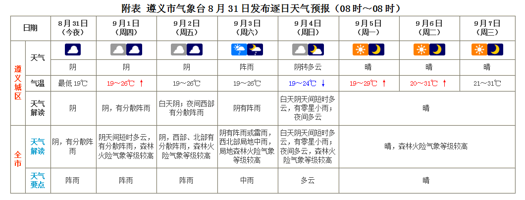 9月4日 周日:白天阴天间短时多云,有零星小雨,夜间多云,城区气温:19~24℃