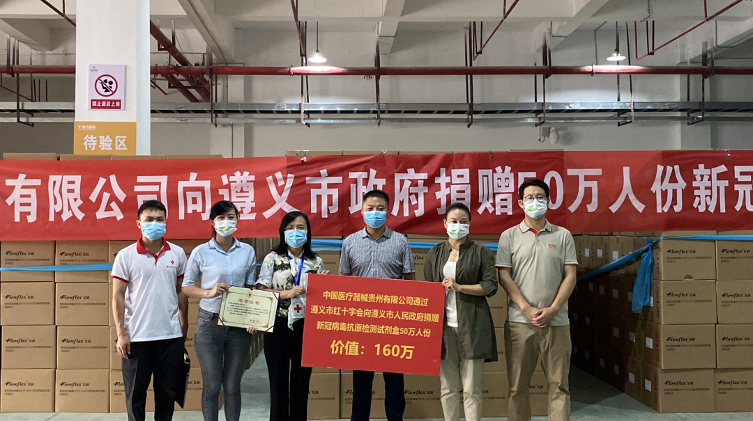 遵义市红十字会充分发挥人道资源优势,第一时间发布接受捐赠公告,建立疫情防控物资保障联动机制、畅通物资接收、调配渠道,全力以赴配合做好疫情防控工作。贵州雨田集团·茅恒酒业有限公司捐赠30余万元医用物资、贵州中安卫生材料科技有限公司捐赠口罩11万只、遵义玉润商贸有限公司捐赠苏打水和牛奶700余箱、贵州农禾山咔咔生态农业有限公司捐赠爱心蔬菜21吨、中国医疗器械贵州有限公司捐赠新冠病毒抗原检测试剂盒50万人份、贵州省红十字会捐赠新冠病毒抗原检测试剂盒50万人份……同时,通过积善谷招募捐款200余笔。