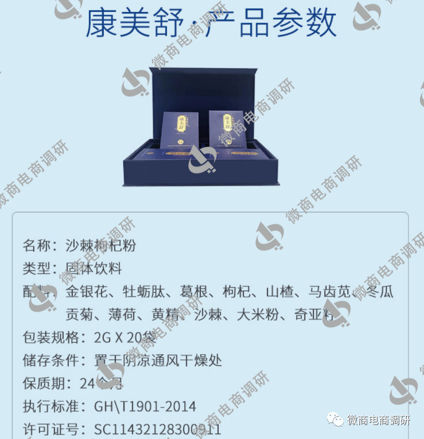 据广昀星官网显示,广昀星产品众多,主打产品为康美舒沙棘枸杞粉,官网介绍这是一款固体饮料,许可证号为SC11432128300911,显而易见这只是一款普通食品。