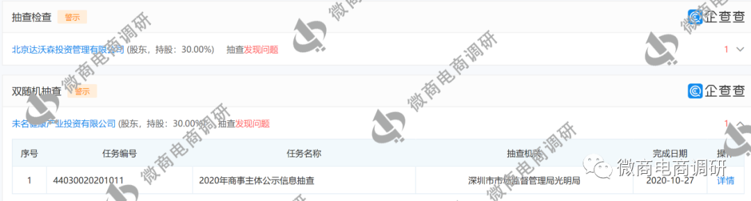 据调查,广东广昀星智能健康管理(集团)股份有限公司的风险提示不断,股东之一的北京达沃森投资管理有限公司在抽查中发现问题。另外一个股东未名健康产业投资有限公司也在抽查中发现问题,曾因为年度报告信息和公示信息的真实性被责令改正。