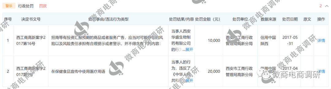 值得一提的是,该产品的生产企业西安华盛生物制药有限公司也曾因在保健食品中使用医疗用语而被行政处罚。