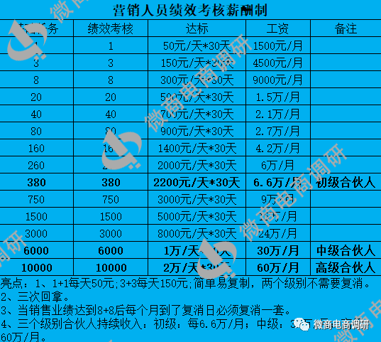 据广昀星某代理团队介绍,其团队采用的制度为营销人员绩效薪考核薪酬制,级别分为初级合伙人,中级合伙人及高级合伙人。团队要求3600元购买一套康美舒产品,即可成为公司营销人员,一天就发50元工资,一个月1500元;购买380套,即可成为初级合伙人,一天工资2200元,一个月6.6万元;购买6000套,即可成为中级合伙人,一天工资10000元,一个月30万元;购买10000套,即可成为高级合伙人,一天工资20000元,一个月60万元。