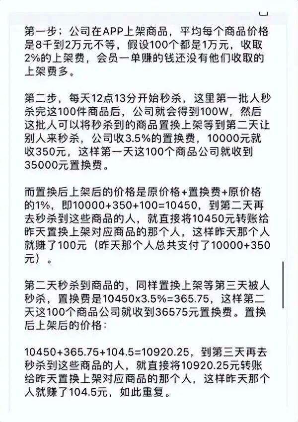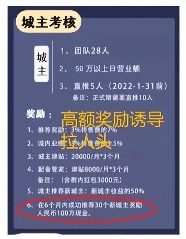 “城联优品”表面打着新型电商平台,颠覆传统的电商和实体,用户可通过参与优购、优秒、转售等商业生态闭环的方式获取收益,实则从软件应用开发到运维就是以前资金盘模版套用,目的只是为了场内用户方便多账号,多订单入金,最终平台会利用改制度,黑客攻击,被某某调查等放肆收割,到时候你app内的资产必将只是数字。再看其静态和动态两种模式,更是和之前崩盘的“拼拼有礼”“思购臻选”同一个套路,所以这个城联优品是个名副其实的资金盘。打个比方:今天在平台消费1万,付款给平台确认发货后,可在平台里面进行转售,转售加价5%,其中利润2%就是200,本金和利息第二天到账,也就是两天一轮,打款收款采用的是点对点。不少用户为此拼命加单,但凡平台危机来袭无人打款,盘子就只能宣布崩盘。动态奖励有直接(3%爱心值的7%)和“城主奖励”、“城主津贴”、“现金奖励”,让众多静态会员蠢蠢欲动,达到了城主条件并在6个月内成功推荐30个新城主就有额外100万元现金奖励,自己想想这些钱是需要谁来填坑,总不能是项目方自己掏钱吧。![]()