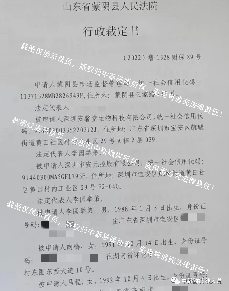 中新融媒接到知情人透露,蒙阴县市场监督管理局在查处深圳安馨堂生物科技有限公司涉嫌传销以及关联方深圳市安元控股有限公司、李园举弟、向梅、马程、柴蓉、万秀丽、魏安琪、肖承荣、朱川、江琳玲,为防止被以上公司及人员转移或者隐匿违法资金,于2022年5月10日向蒙阴县人民法院提出申请,要求冻结以上公司及人员在金融机构的银行账户存款,共计冻结额度1.75亿元。