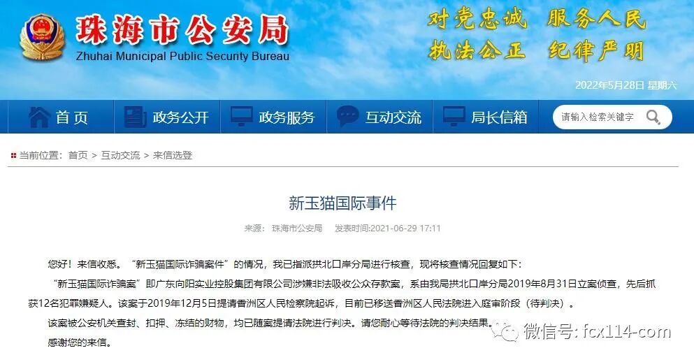 截至2022年5月23日,已将李某某、胡某某、黄某某、魏某某等18名犯罪嫌疑人移送法院审查起诉,本案中依法查封、扣押、冻结涉案资产约达六千万元人民币,已一并提请法院审理判决。目前各项侦查、追赃工作仍在全力开展中。现通告如下:一、公安机关告诫广东向阳实业控股集团有限公司及其关联的子公司的从业人员,自本通告发布之日起,主动到拱北口岸公安分局经侦大队退缴在公司获取的非法所得。二、敦促已收回本金的投资人和单位主动到拱北口岸公安分局经侦大队退缴非法获利。三、请尚未到公安机关报案的投资人携带所需材料尽快到公安机关报案。根据相关法律规定,及时退缴非法获利、赃款可依法从轻或减轻处罚;对于拒不退缴非法获利、赃款的人员和单位,公安机关将依法追究相关法律责任。同时,也请投资人积极配合公安机关开展调查取证和追赃挽损工作。我们打开珠海市公安局官方网站上查询可以看到所有关于“新玉猫国际”平台的通告原文: