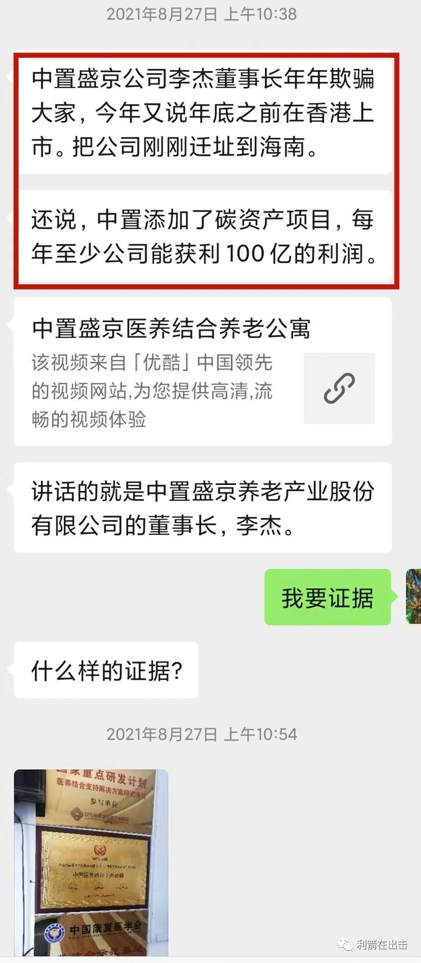 从截图中看出,沈阳中置盛京公司以“发售股权,香港上市”为噱头,一股一元钱,忽悠老年人交钱,一个“股权证”至少要求是10万股。利箭曾经为老人支招,去公司和平解决退款,把钱退了,就是上策。老人一次又一次去公司,要么就是“下周来给你解决.......”,要么就是“老总不在....”,要么就是各种理由,反正就是不退还老人的钱,后来老人组织了沈阳本地的一些老年人上门去讨债,老板干脆来个无影无踪,就是不见人。