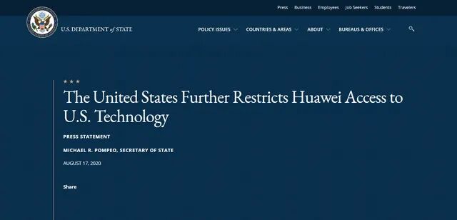 在美国国务院官网发布的声明中,蓬佩奥称,“国务院强烈支持商务部今天扩大其外国直接产品规则,这将阻止华为通过‘替代芯片生产’与‘提供用从美国获得的工具生产的现成芯片’来规避美国法律。”