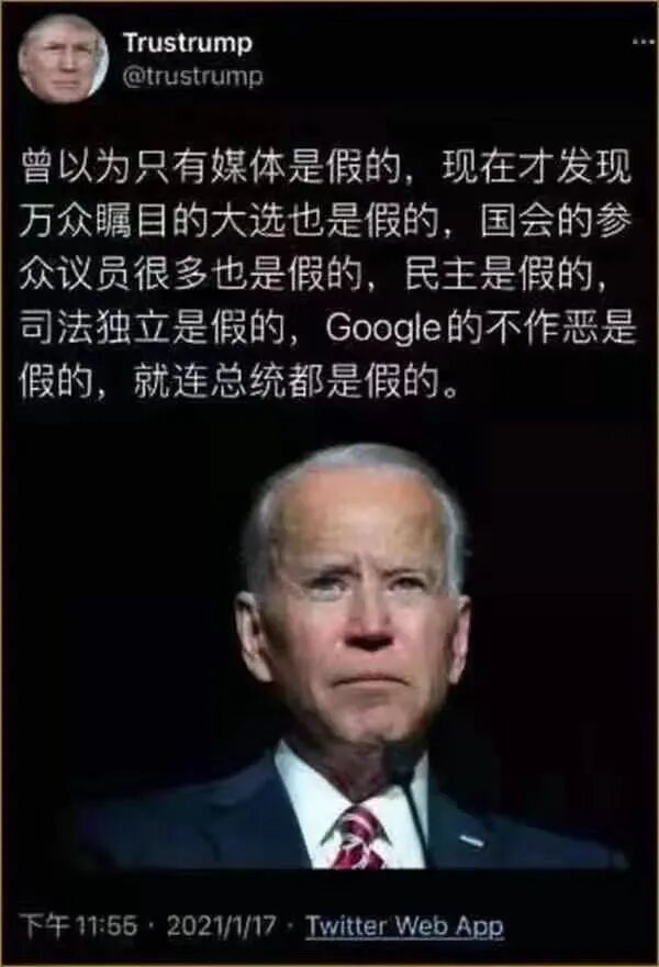 关于2020大选是否有规模性舞弊,各方已有诸多报道,我在此就不赘述。但对于这种一下无法看清真相的大事,我只用常识判断——1、美国合法注册的选民1.33亿,2020总统大选的最终普选票的统计结果是:特朗普得7422万票,拜登得8128票,两数相加为1.55亿,怎样解释这天上飞来的2250万张选票?我知道已有包括国会议员在内的多方人士做在六个摇摆州不合法选票的实际调查。他们和我有同样的质疑。真相总有一天会大白于天下。2、我同时不相信在一个普信基督教的国家会有600多个平民百姓会在多个不同的州同时宣誓做假——他们有大选舞弊的证据。在此请注意一个关键的问题,至今为止总共有86桩在地方法院对大选法院的起诉,确实没有一例成功。但并不是法院经过审理后判决起诉方败诉。而是都被“dismissed ”掉了。即取消了。换句话说都没有经过公开审理。虽然这听起来非常蹊跷,但也不难理解。因为法庭对有效证据的界定及证据的呈现方式都有特定的要求,如不符合即被取消。3、我也不相信75%的共和党人都是傻子或骗子——他们都认为大选有问题。正如肯塔基州的参议员Rand Paul 所说——上万张密希根州的选票只有名字没有地址的选票应该不计入统计,但还是被统计进去了。宾西法尼亚州政府在本次大选前改变计票的时间是违宪的,这也是诸多共和党议员的共识。4、我还不相信美国一批德高望众的人士会突然有一天联手作恶——76岁的纽约前市长朱利安尼(Rudy Giuliani),他是美国最大城市连续两任的顶级民选官员(1994-2001),也是纽约史上最有威望的市长——因为清扫纽约黑手党而名振四方;65岁的鲍威尔律师(Sidney Powell),做过10年美国联邦政府的检察官(1978-1988);68岁的林伍德(Lin Wood)律师,从业44年、全美最知名的专打专诽谤官司(25年)的律师;——是他们自始至终站在第一线,冒死坚称2020年大选舞弊,特朗普才是真正的选票胜出者。5、我更不相信一个不代表民意的政权会在民主体制中能不被推翻。说到民意,你可以不去思考为什么这样一个美国史无前例现实——一个政府的上台宣誓就职要靠戒严军管来实现。国会大厦要封上铁丝网,大街要筑上水泥桩,两万五千个来护卫的军人要做背景审查——这一切不都是一个标准的专制政权所为?一个从心底害怕人民的政府所为?说到民意,你也可以无视两个竞选人在上百场竞选演讲时一个天上一个地下的人数对比。你或许可以用一派人完全被疫情所束缚,另一派人全都不在乎疫情来解释。但无论如何在谈到民意时你不能不相信电子统计——拜登就职演说的YouTube转播中,当有1500点赞的同时,有1.1万人点踩。一旦认定大选舞弊,在位总统还有什么合法性?相信最高法院的九个大法官会得出公正的结论。而当总统副总统被双双免职,虽然美国历史上没有先例可循,但还有什么选择比让获得了史上最多选票的人执掌白宫大权更能让美国民众接受的?这需要时间。虽然乌克兰已经对拜登儿子贿赂的相关政府官员起诉,虽然意大利的“多猫腻”选票机做假的工程师已做宣誓证言,但在这种时候世界却不是平的。不知道地球另一端的真相还要经过多少崎岖才能抵达此岸登陆。但我不相信任何一个人,一个党派可以一手遮天。我只相信真相永存。虽然这真相可以在一个时间内被封杀。但它终将大白于天下。而当真相穿越千山万水走进华盛顿的国会山时,我相信弹劾总统就不再是一种党派之争,而是超越党派的正义审判。到那时,不驱一兵一卒便可还人民以公正,还历史以清白。这需要时间。美国媒体已传出了消息——特朗普的大儿子与新世界首富“火星人”马斯克已探讨了建立新的媒体平台的可能性。同时表明特朗普可以加入。
