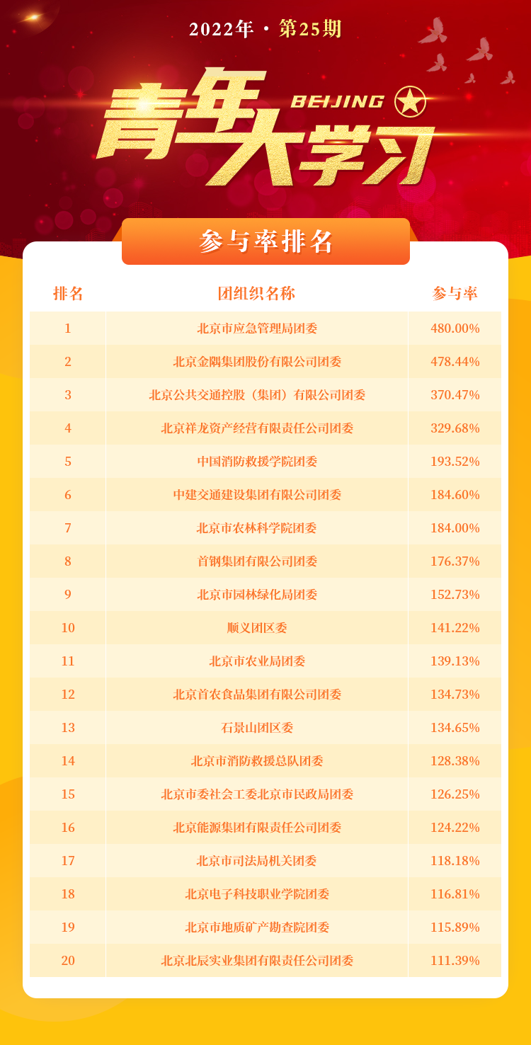按照每个团组织参与人数/团员总人数的比例来看,北京市应急管理局团委参与率拔得头筹,北京金隅集团股份有限公司团委、北京公共交通控股(集团)有限公司团委位居前三名。