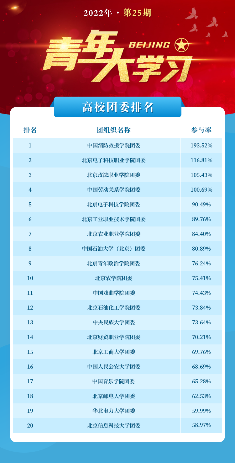 注:按照高校团委单位参与率由高到低排名,参与人数为“青春北京”微信公众号“青年大学习”答题通道的统计数据。