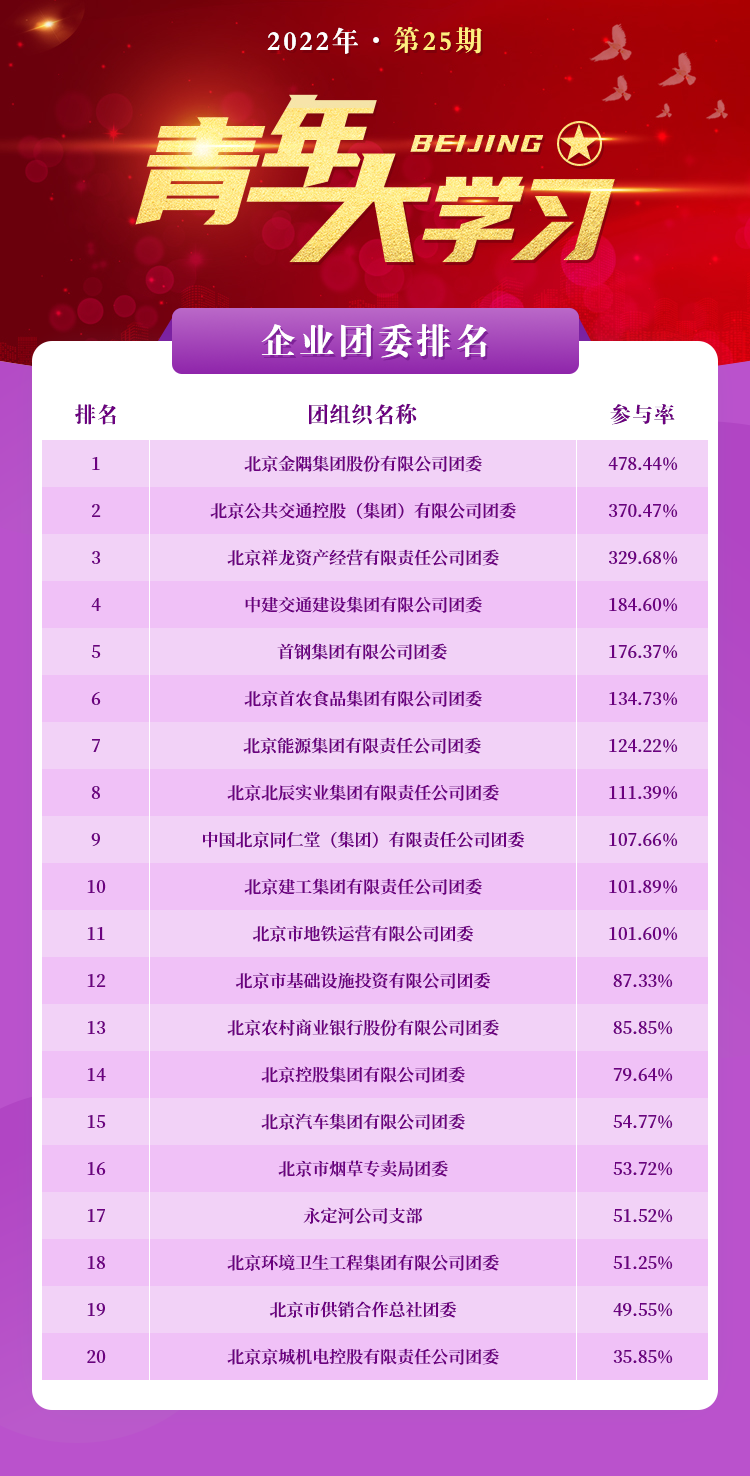 注:按照企业团委单位参与率由高到低排名,参与人数为“青春北京”微信公众号“青年大学习”答题通道的统计数据。