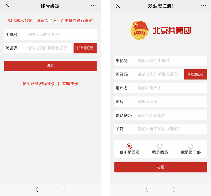 如未注册“北京共青团系统”需注册账号