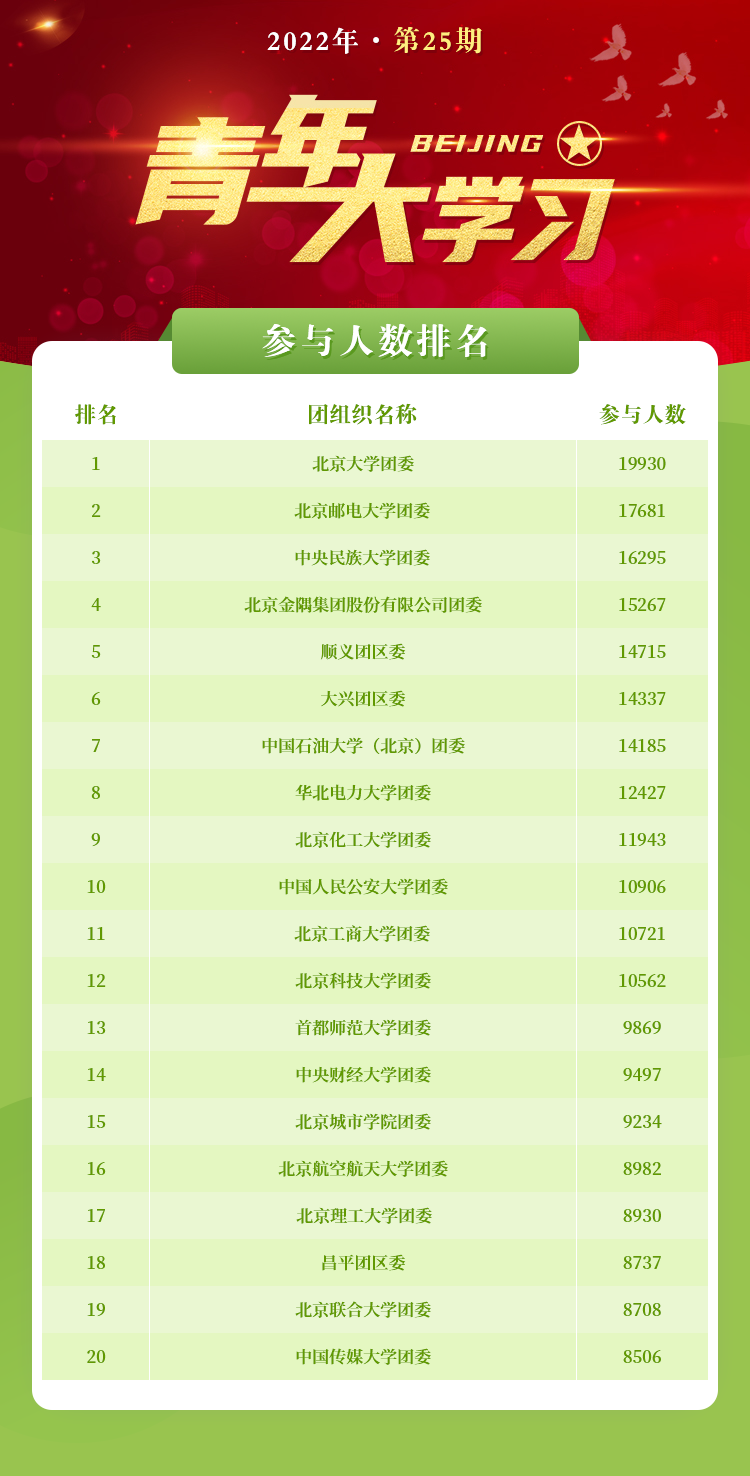 注:按照组织机构单位参与人数由高到低排名,参与人数为“青春北京”微信公众号“青年大学习”答题通道的统计数据。