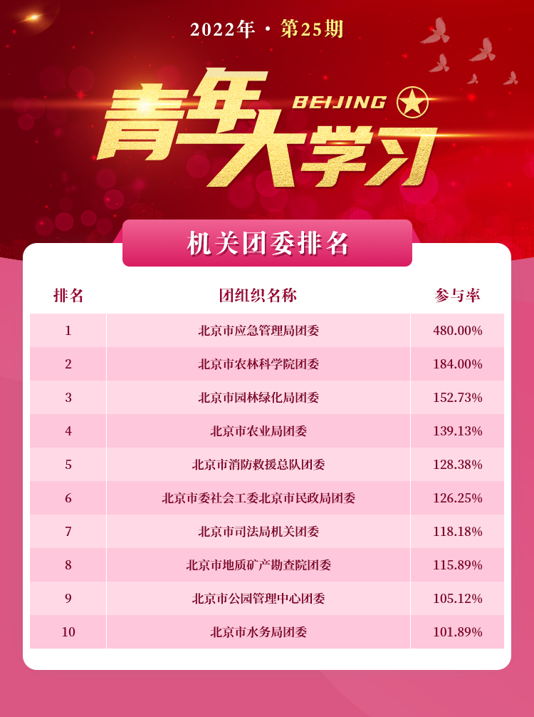按照各单位团组织参与率来看,北京市应急管理局团委、北京市农林科学院团委、北京市园林绿化局团委位居前三名。