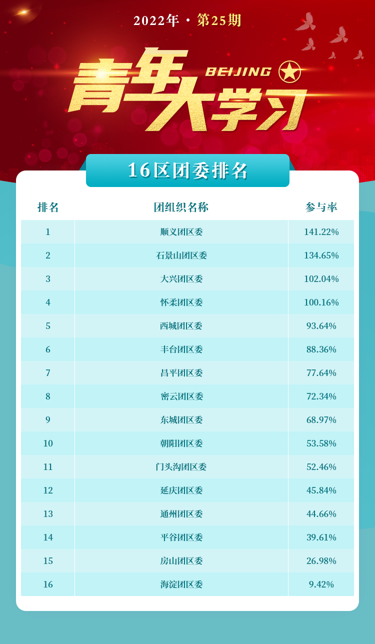 注:按照16区参与率由高到低排名,参与人数为“青春北京”微信公众号“青年大学习”答题通道的统计数据。