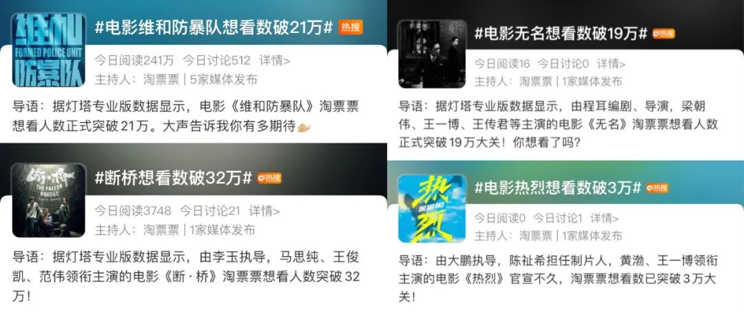 #电影维和防暴队想看数破21万#,#断桥想看数破32万#,#电影无名想看数破19万#,#独行月球想看数破50万#,#电影热烈想看人数破3万#……