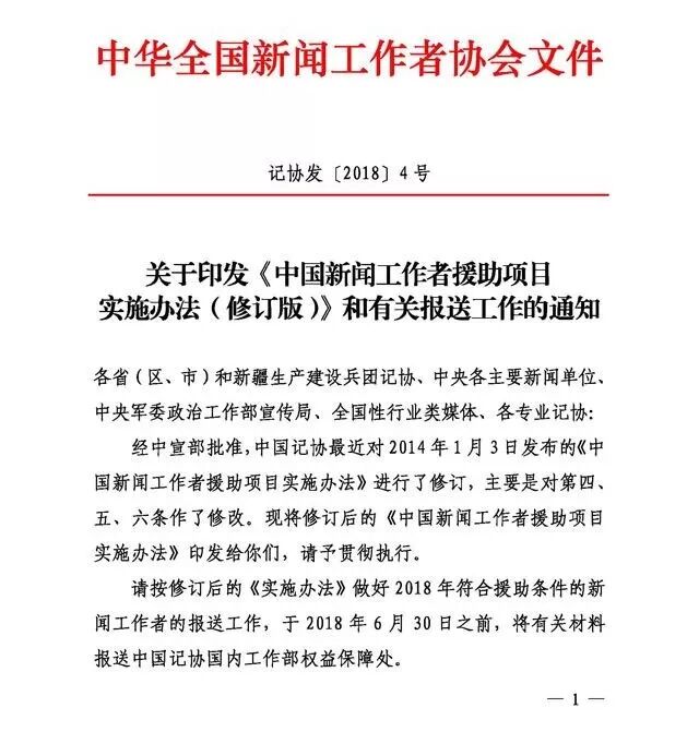 今天,中国记协网发布题为《新闻工作者援助项目实施办法今年修订 申报工作启动》的文章,并配发相关通知(上图)。