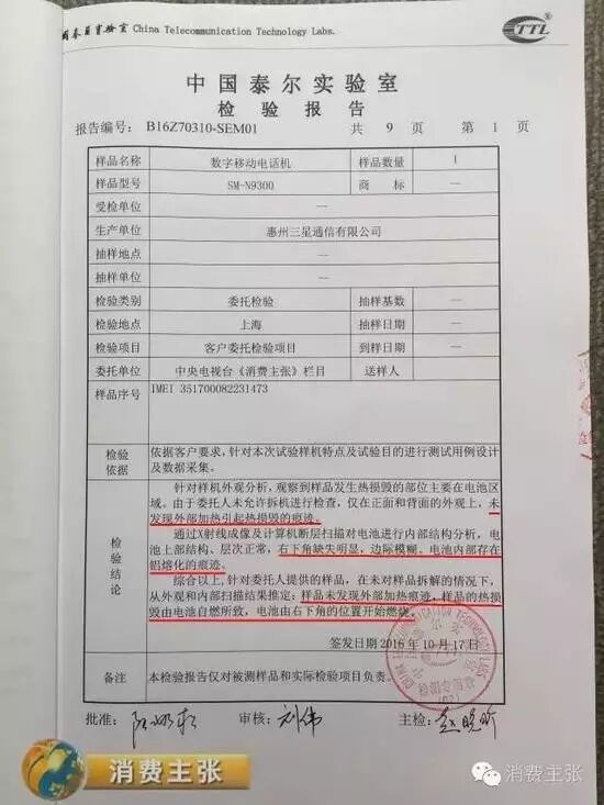 18日,工信部下属的中国泰尔实验室正式向央视《消费主张》栏目提供了中国第一例由消费者送检的三星国行版Note7燃损手机的检测报告。报告显示,手机燃损原因是“电池自燃所致,电池由右下角的位置开始燃烧”。