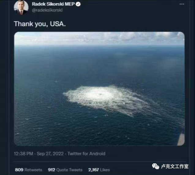 事发后,波兰前外长拉德卡·斯科罗斯基发了个推特,“谢谢你,美国”,下面配图是被破坏的北溪-2管道泄露出来的天然气。