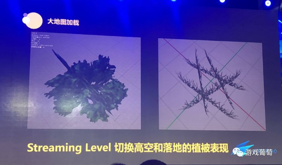 这个是我们的树和草,在空中看到的树就是这样的一个树,我们把这样的树在玩家落地之前直接用Streaming Level卸载掉,大家会看到卸载掉之后不会有任何影响。草是对引擎原有的渲染方式做了一点优化,视野之外刷出来的草是不会绘制的,只绘制视野里面的草。