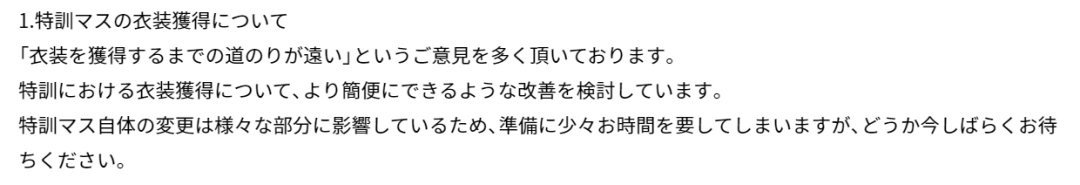 但这些设定治标不治本,如今,养成体系带来的问题依旧是玩家反馈最多的一部分。而官方表示要在今后调整相关的设计,包括体力恢复率、体力上限、解锁服装的门槛,以及素材掉落率、素材本限制次数。