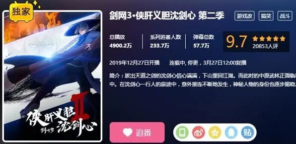 2018年9月开播至今,《沈剑心》动画共出了两季。第一季全网播放总量达5.7亿次(《剑网3》十周年发布会数据);正在上映的第二季版权被B站买断,站内播放总量已超过4900万次,在2020年Q1的B站动画中位列第一梯队。