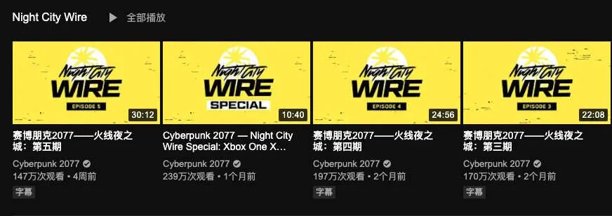 我们会觉得《2077》的营销规模超过了相近体量的作品,原因也绕不开 CDPR 在中国市场做了相应的本地化布局。比如说在去年年底,《2077》的情报站就已在 B 站上开通,平台方发起了预约活动、赛博朋克文化的视频征稿,《火线夜之城》的中文视频内容也在通过 B 站渠道对外传播。