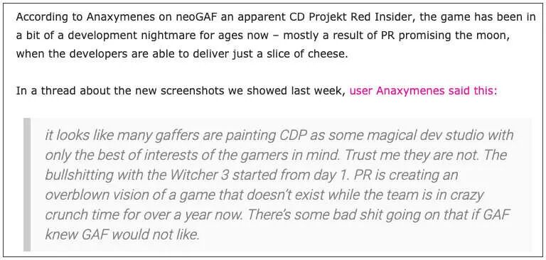 就像《2077》一样,《巫师3》在发售之前,就已经背负着外界的质疑。2014年,一位 ID 为 Anaxymenes 的用户以「业内人士」身份在游戏论坛 NeoGAF 进行爆料。据他声称,《巫师3》打从项目公布的第一天开始,就在通过宣发来制造假象,而游戏的实际品质未必如人们预期中的那么好。
