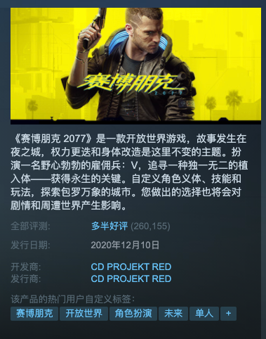 实际上,参照《巫师3》的宣发,我不觉得 CDPR 营销过剩。为博人眼球,各家游戏厂商多少会有「画饼」行为,而《2077》在宣传上更多是扬长避短,不至于像《无人深空》那样给出了近乎错位的营销。事实上,《2077》的口碑还不至于整体崩盘,在 Steam 平台上,游戏便处于多半好评的状态。