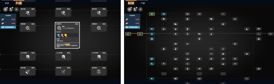 左为机甲性能提升系统、右为科技树系统