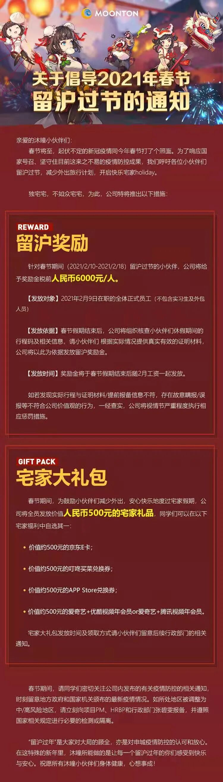 第三家是沐瞳:所有留沪员工可以得到税前6000元的奖励,此外全员还有价值500元的宅家礼品。
