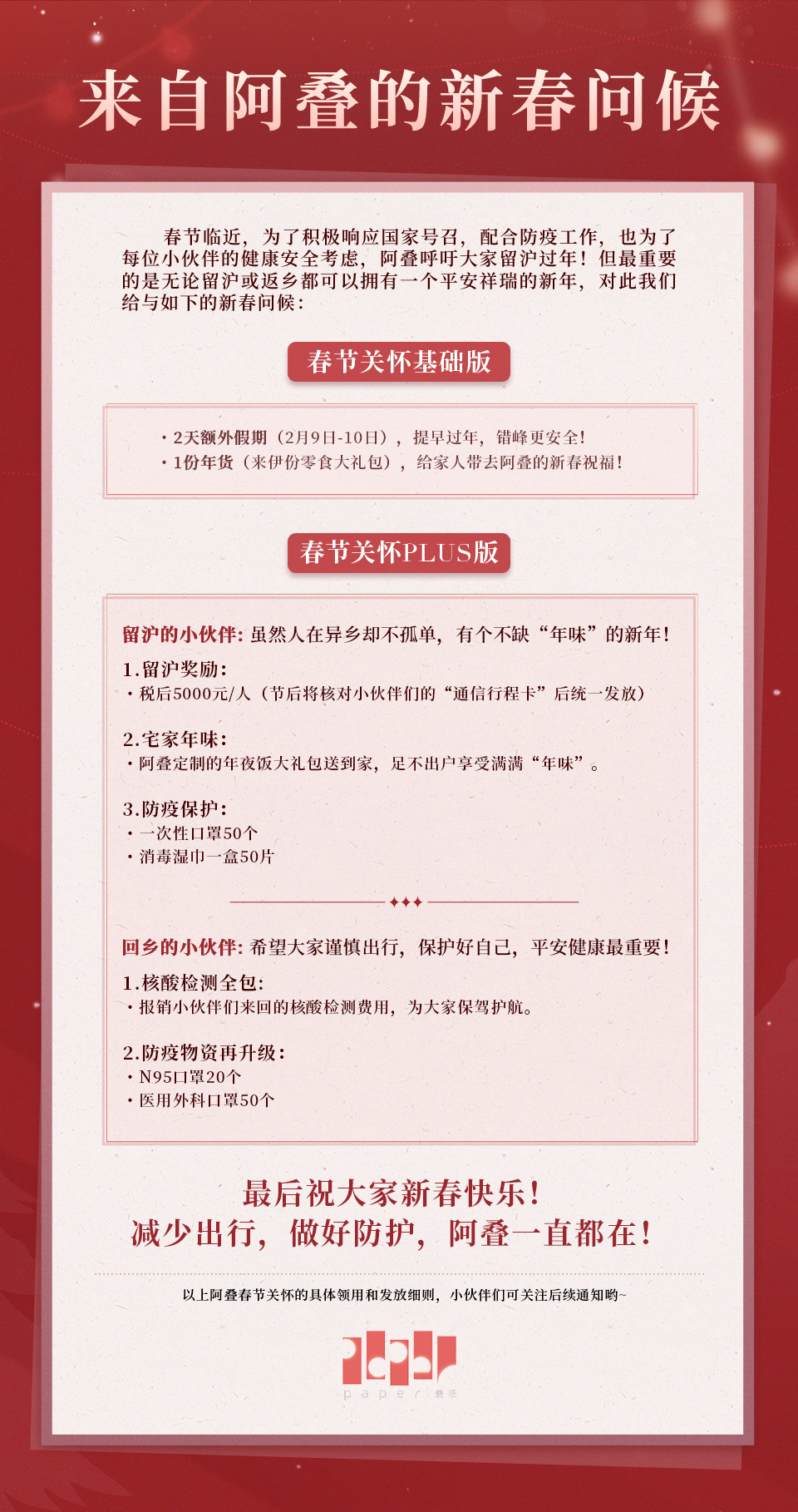 第二家是叠纸,他们的留沪员工将得到税后5000元奖励、年夜饭大礼包和防疫物资,回乡的员工也有防疫物资,并且能报销核酸检测费用。另外,所有员工还有2天额外假期和一份零食礼包。