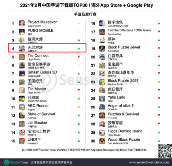 同时在这个过程中,《MLBB》的方法论、运营体系、内容结构都在深化、沉淀,于是游戏跟东南亚用户的关系更紧密了。截止2021年2月,在一众实力新品冲击海外的节点上,这款游戏仍然位列出海收入榜第15位,出海下载榜第4位,MAU达到9000万。