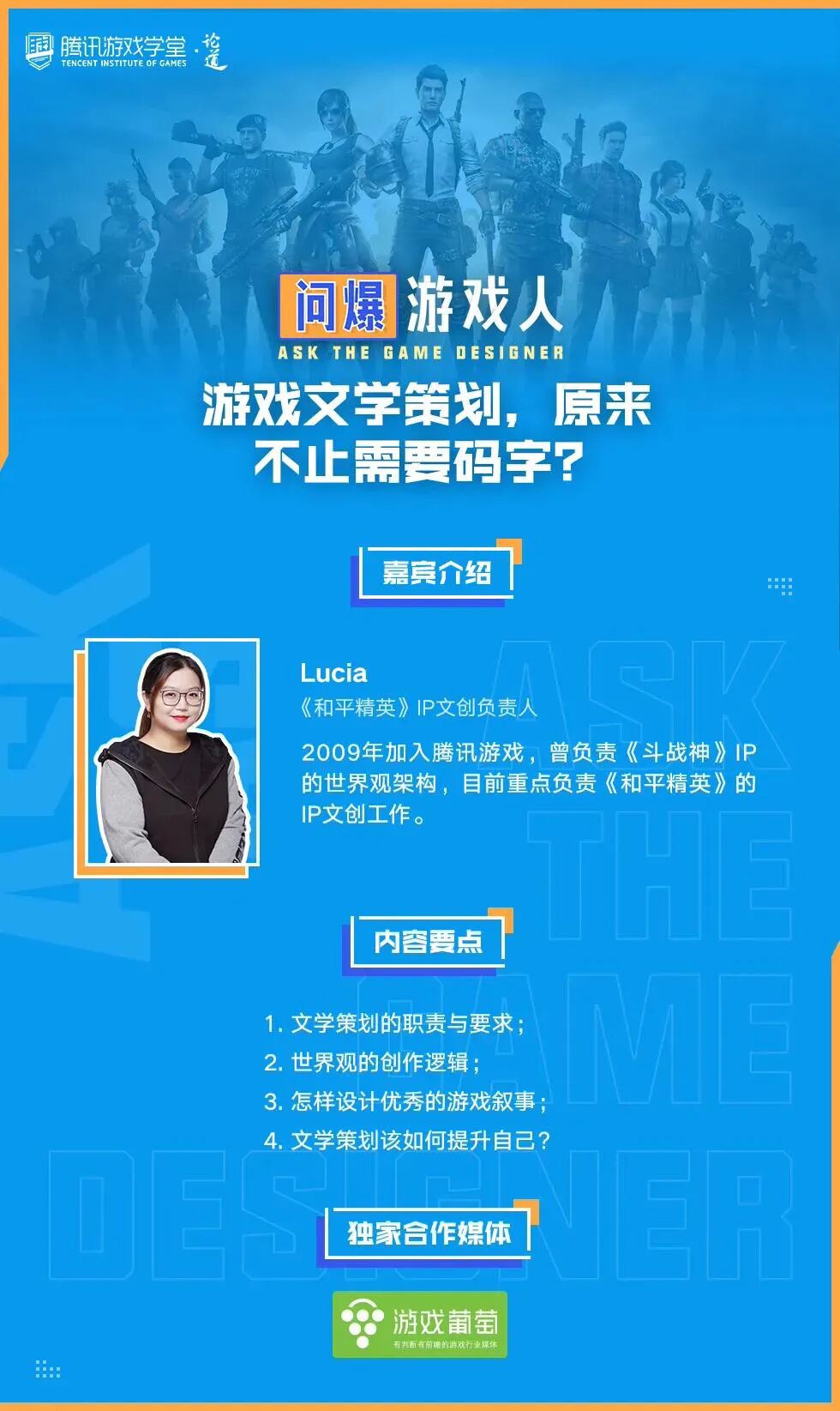 在这种情况下,腾讯又是怎么看待叙事设计的?最近,葡萄君与腾讯游戏学堂的《问爆游戏人》栏目组,采访了来自腾讯光子工作室群的叙事设计专家Lucia。她于2009年加入腾讯游戏,曾负责《斗战神》IP的世界观架构,并且带领团队成立了光子的叙事中台,支撑过超20款产品的IP研发、拓展,目前重点负责《和平精英》的IP文创工作。