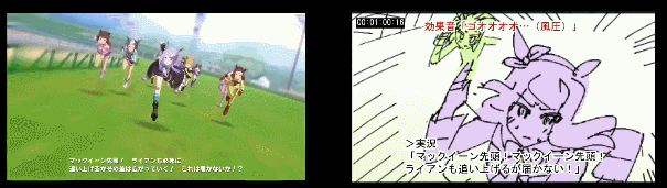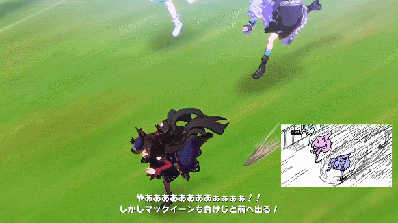 同时这些镜头都更强调临场感,给人以「能近距离感受赛马娘的情感」的印象。赛跑前半段,镜头都优先拍摄目白麦昆,中期米浴慢慢加入镜头,两人同屏的频率也变高,最后阶段,米浴加速,米浴占据了屏幕的大部分,然而目白麦昆不甘落后的态势也需要描写,受人瞩目的对决结果不断变化,让观众能够设想更加白热化的展开。这便是这组分镜的具体设计意图。