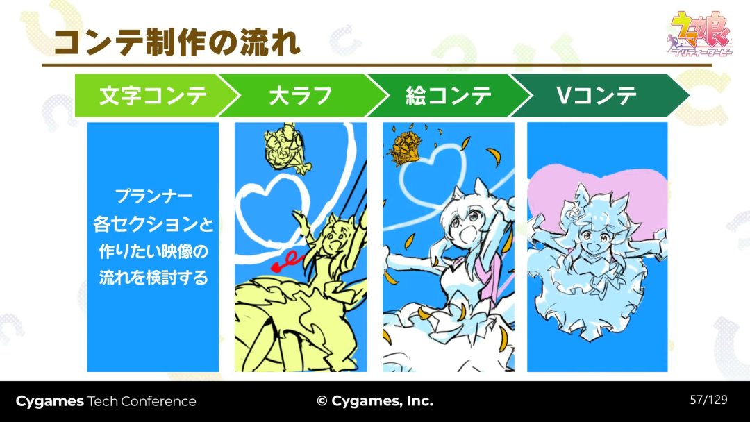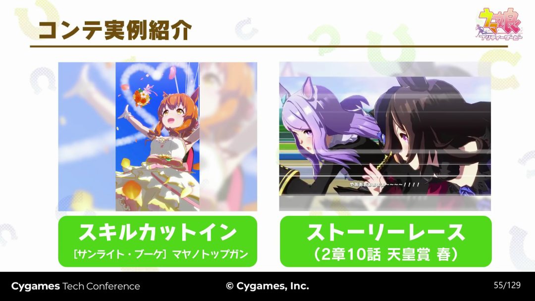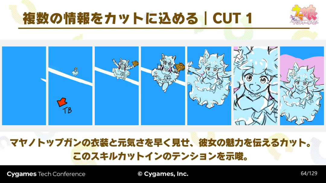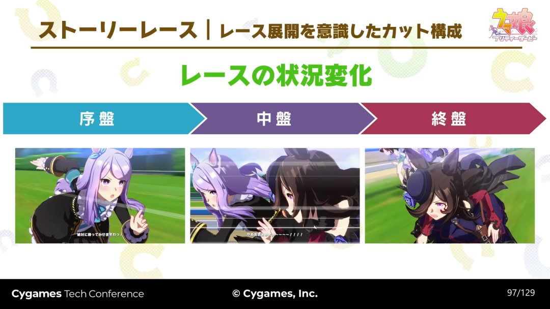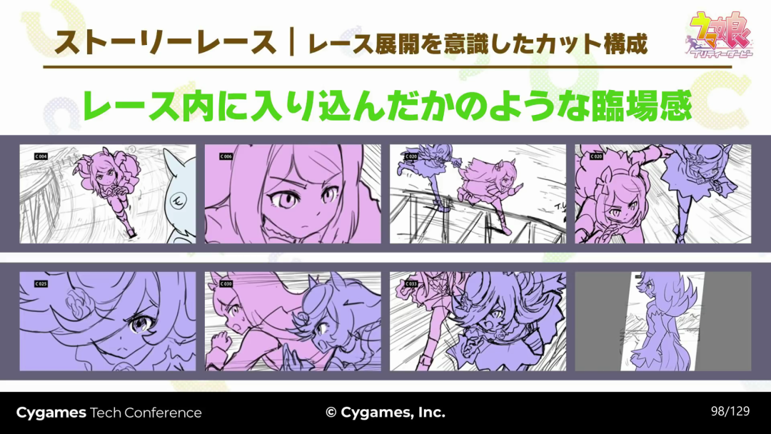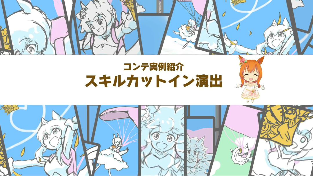 前半段分享中,我们提到了分镜在《赛马娘》制作中的重要性,以及分镜组的大致工作目标和流程,接下来进入实例拆解的环节,具体要介绍的,是游戏中常见的技能Cut in演出和主线故事内赛跑场景的演出。