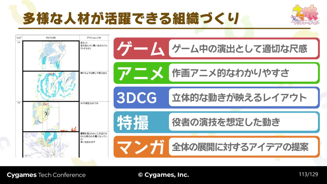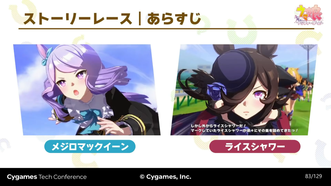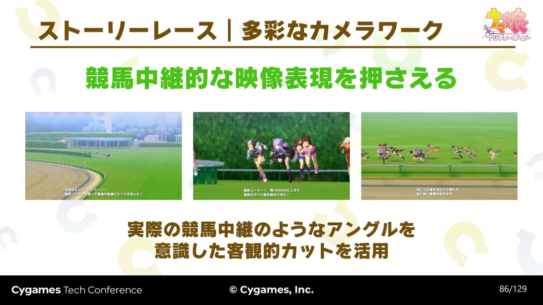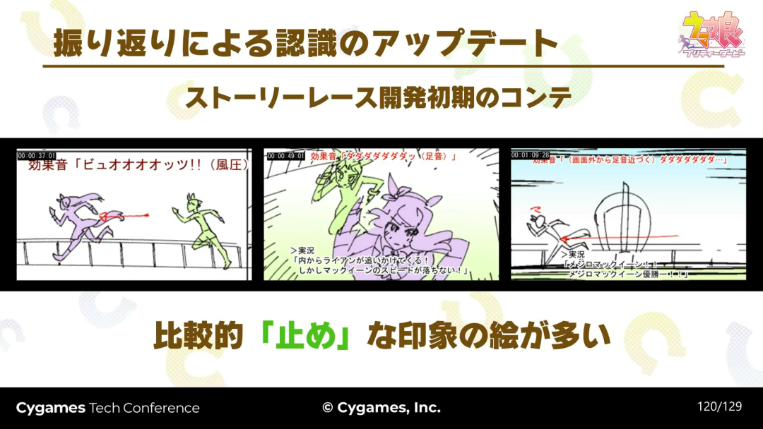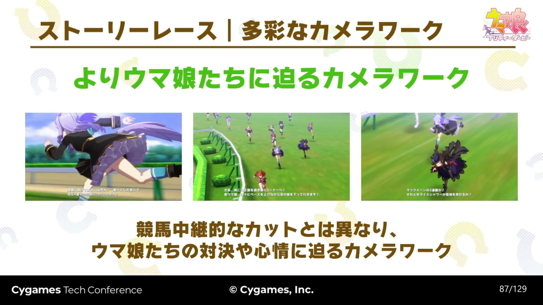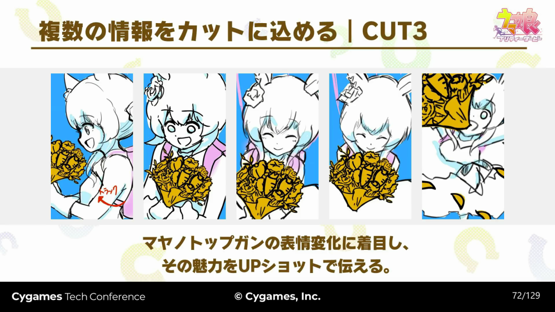 前半段分享中,我们提到了分镜在《赛马娘》制作中的重要性,以及分镜组的大致工作目标和流程,接下来进入实例拆解的环节,具体要介绍的,是游戏中常见的技能Cut in演出和主线故事内赛跑场景的演出。