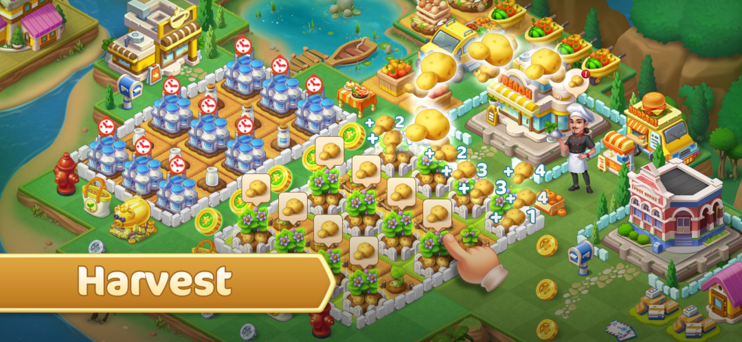 《Merge County》里,玩家可以很清晰地看到,庄园通过自己手动的合成操作,一步步从小房子升级成大house,景物、摆设一点点丰盈起来的过程。也能看到种植面积的扩大、品种的升级。相比一部分玩法通过三消关卡产出的货币转化,“亲身参与”感更强了一些。