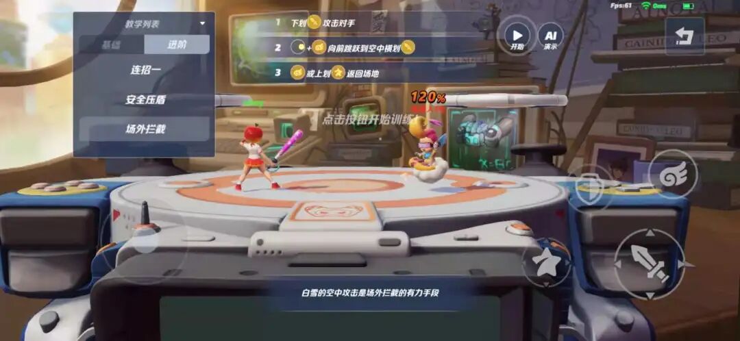 同时,格斗游戏中每个角色的招式效果不尽相同,为了让玩家快速理解一个新角色,《派对之星》也针对性地做了新手引导。当玩家每次选择一名新角色进入游戏时,系统都会先匹配一把人机比赛,并提供教程,说明该角色哪个技能适合用来打伤害,哪个技能又是收割用的击飞技。