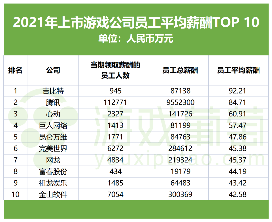 除吉比特、腾讯外,员工平均年薪TOP 10的游戏公司为心动、巨人网络、昆仑万维、完美世界、网龙、富春股份、祖龙娱乐和金山软件,其员工平均年薪皆超过40万元。