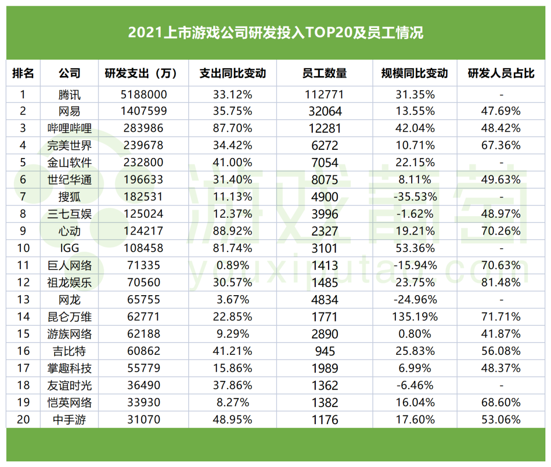 以下为2021年上市游戏公司研发投入TOP 20及员工情况。需要注意的是,表格所统计的研发支出为公司整体研发支出,研发人员为财报披露的公司全部研发或技术人员(不仅仅为游戏研发人员)。