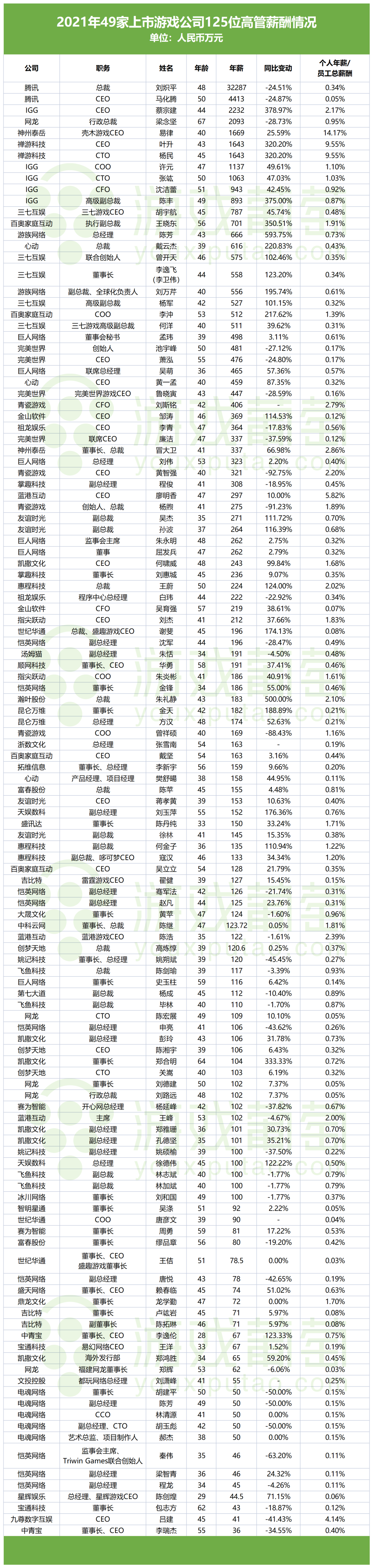 可惜腾讯并未披露这两位员工的个人信息,因此13亿的年薪究竟花落谁家并没有办法得知。不过,随着各家上市游戏公司的财报披露,葡萄君搜集到了来自49家游戏公司的125位高管薪酬数据,具体如下: