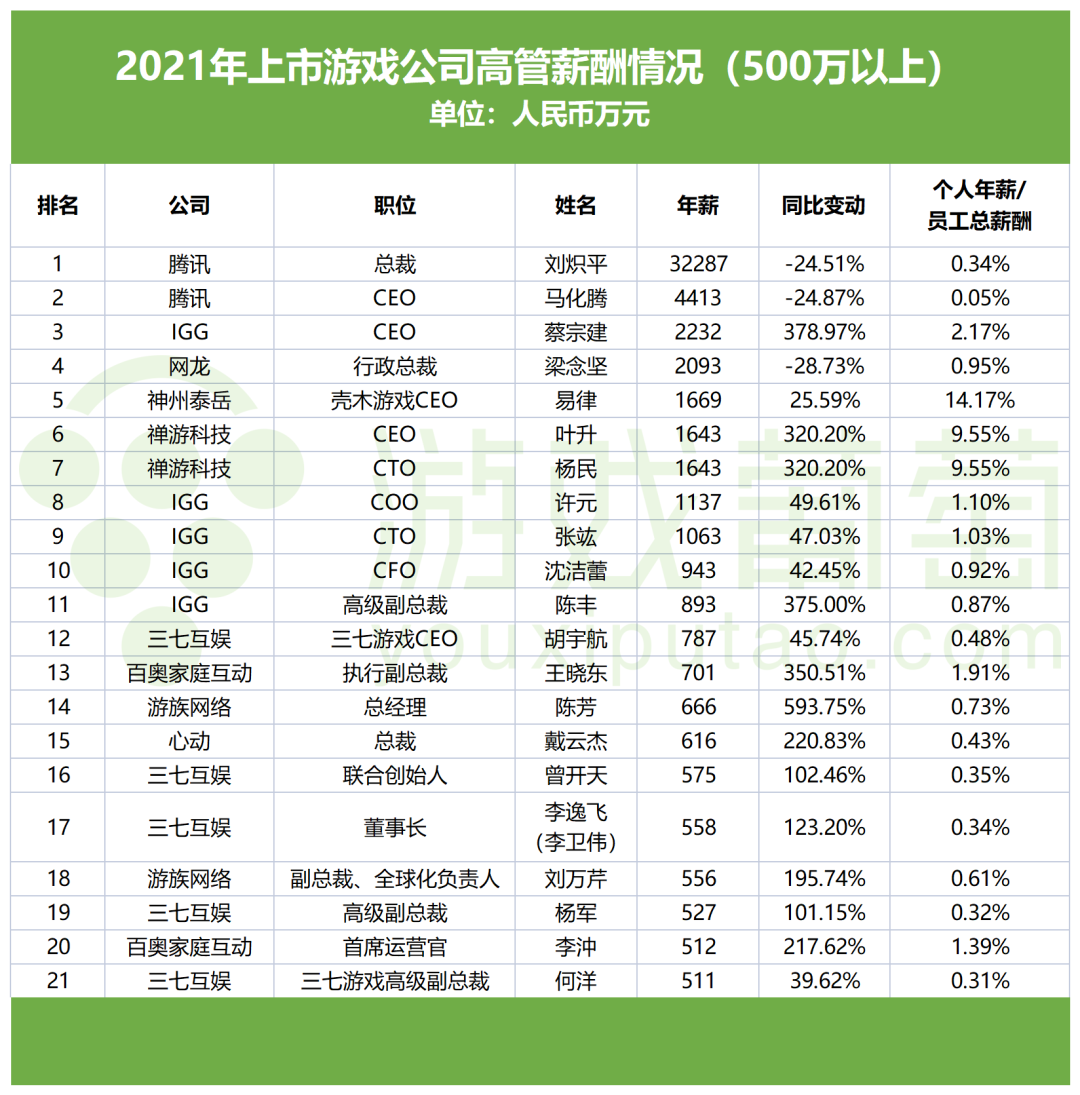 在统计的49家上市游戏公司的125位高管(本文指高层管理人员及董事)中,年薪最高的为腾讯集团总裁刘炽平,其2021年的总酬金(含股份收益)约为人民币3.23亿元,这相当于本次统计的其余46位年薪200万以上的高管薪酬总和。