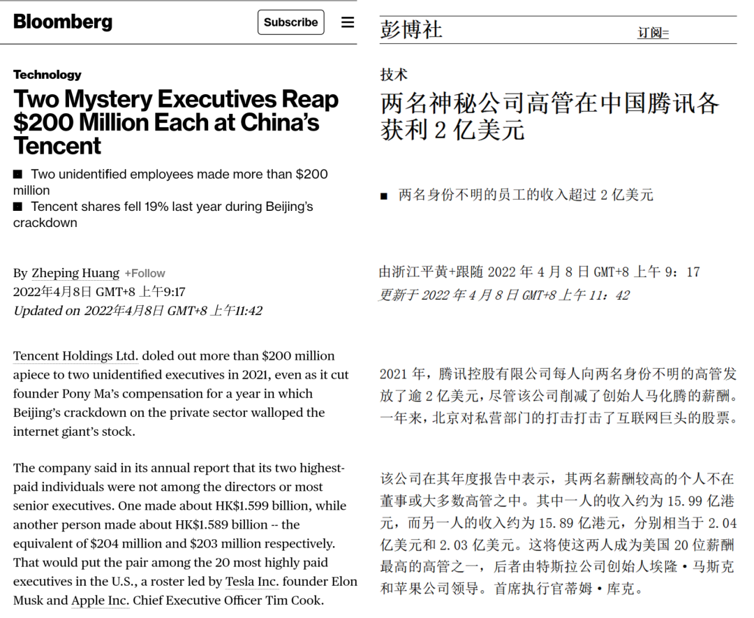 同时,财报称这两位员工并未担任任何董事职位——与之相比,腾讯创始人、CEO马化腾年薪仅人民币4413万元,不到这两位员工任意一人年薪的3%。彭博社也曾报道称,这两位员工将与苹果CEO库克、特斯拉创始人马斯克等人共同列入美国高管薪酬TOP 20。